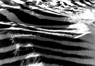 Dans Les Peaux, autre série en noir et blanc, c’est cette double lecture qui est convoquée: une image concrète d’une peau à la fourrure zébrée ou bien un paysage mental à l’espace infini: évoquant le flux et le reflux, tout n’y est que mouvement. La lumière perce presque de part en part les minces vagues rapides en forme d’éventail qui se poursuivent sur la berge – tentative de plongée en apnée du regard pour découvrir le sens sous la surface.