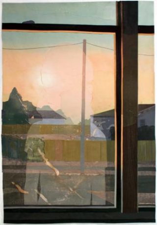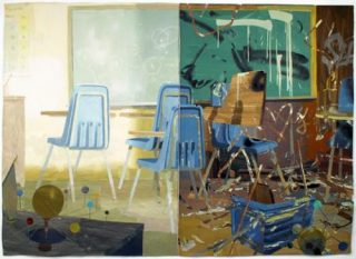 Matt Bollinger peint des morceaux de papier qu’il déchire et colle successivement en montant du fond vers la surface de manière à ce que la sensation colorée se combine à celle de la matière, comme s’il était possible de «toucher la couleur». Dans Grand Prairie School, en plaçant parallèlement deux instants différents d’une même scène dans un espace continu et en accompagnant par la dimension tactile du collage le caractère narratif du sujet, il provoque le trouble que procure une présence physique. Ces collages d’impressions indéfinissables alliés à des souvenirs précis jusque dans les détails, procurent un sentiment de nostalgie et de solitude, relevant d’histoires vécues ou de situations réelles. Matt Bollinger revient sur son passé d’élève à Kansas City (Missouri).