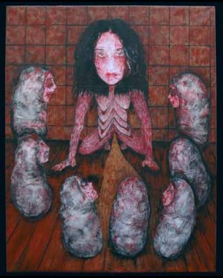 Aux antipodes des photographies poétiques de Bianca Sforni, les peintures de Lyzane Potvin coupent court aux rêveries du spectateur. La jeune artiste se met en scène dans des décors sordides régulièrement affublée d’une tête de truie, dévorant des organes non-identifiés, se mutilant, se masturbant et glorifiant des objets tranchants divers et variés. Le corps de l’artiste, martyrisé, scarifié, parfois amputé d’un membre ou deux, distille une atmosphère désagréable relevée par un fumet de religiosité émanant des inscriptions comme «Ne nous soumets pas à la tentation et délivre-nous du mal».
