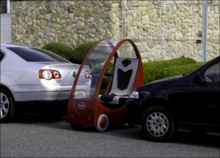 ― Dock Dock ( Jaime Lerner), mini voiture électrique à usage collectif, 2009. Prototype. Dans l’exposition «La Ville mobile», Biennale du design de Saint-Etienne.
