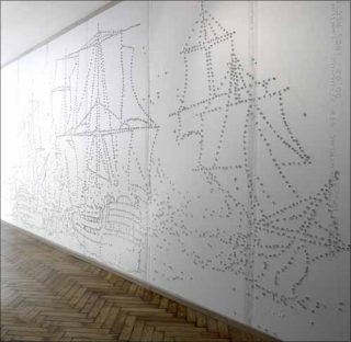 Tout le charme de «Big» réside dans cette mise en situation. Une marine naît ainsi d’œuvres éparses, Nelson (2002) d’Alain Declercq, Aruba 49cc (2005) de Daniel Dewar et Grégory Gicquel, et When I Have a Skull Full Of Wind. Sept panneaux en placoplâtre, criblés d’impacts, dessinent les contours d’une flotte amirale, ils brossent l’assaut final de la bataille de Trafalgar. Des hauts-faits historiques… en pointillés !