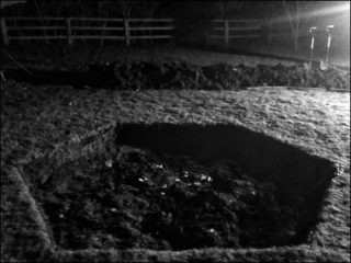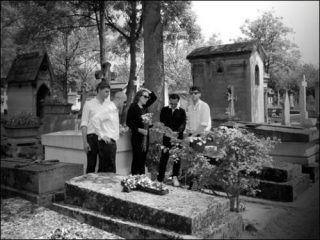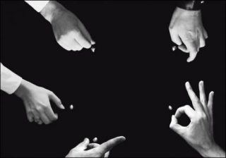 Des tirages noir et blanc, format affiche, mixent des clichés positifs et négatifs, imbriquant des silhouettes de joueurs de bille en smoking et de fantômes, voilés de drap comme il se doit. Dans une vitrine, une main de femme élégante, gantée de noir, présente ce qui pourrait être une queue de bille couleur ivoire, parfaitement cylindrique, et curieusement plus épaisse qu’une queue de billard. Dans une autre, des mots, incongrus, hors propos, gravés sur des billes d’acier alignées en rang d’oignons comme des trophées. Dans le foyer, une piste de jeu, intégralement tapissée de noir.