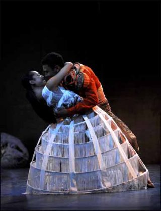 Si Angelin Preljocaj lui-même qualifie son projet de grand « ballet romantique contemporain », le choix du conte des frères Grimm ne lui laisse qu’une mince part de réelle liberté. Fidèle au récit original et s’imposant ce critère comme une stricte discipline à laquelle il consent gracieusement, le chorégraphe prend très à cœur de dérouler le fil d’une narration composée pas à pas. Les séquences les plus espérées du conte se développent dans une mise en scène manifeste avec une allégeance pleinement assumée. On s’apprêterait presque à fustiger ce manque d’extravagances, mais c’était sans compter sur sa collaboration avec le créateur Jean Paul Gaultier qui offre des costumes tout aussi somptueux qu’inattendus.