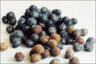 L’artiste choisit par exemple ses matériaux pour ce qu’ils opèrent dans l’œuvre, le projet qu’il formule pour elle. La liste en est longue, disparate et potentiellement infinie mais elle fait toute la richesse des textures et l’étrangeté des formes: les vis, les semences de tapissier, les baignoires, les nichoirs, les bonbonnes de gaz, les chaussettes, les cure-dents, mais aussi les ossements d’animaux, la peinture d’autoroute ou la poudre pour cartouches de chasse. La paraffine fige un drap en plis, la semence de tapissier, au lieu d’être plantée, adhère à la surface et présente en pelage ses pointes acérées, l’écorce de l’arbre, peau parmi les peaux, se voit elle-même protégée d’une couche de paraffine délicatement passée au pinceau…