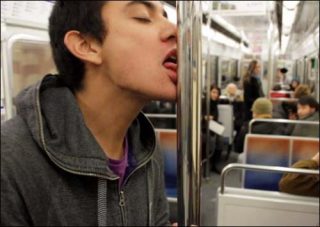 De longueurs d’ondes différentes. Vibrations alternées. Les différents plans-montages-cadrages-superpositions s’accrochent en une ronde débordante d’énergie vitale, modulée, offensive, à l’assaut de la matière inanimée. Une langue vigoureuse attaque, fouille, lèche une barre de métro, sous un éclairage blafard — du bleu dans le néon blanc. Regards fuyants des passagers, chopés au cœur de leur routine de normalisation par un cadre impitoyable. Sensualité métallique. Morsure sous peau. Sensualité torve, qui se fraie un chemin dans la salle obscure. Blue movie. Ils sont réveillés, les passagers captés dès le début par le film d’Ivan Argote, comme ceux qui s’installent sur les canapés de récup dans l’espace de la galerie, disposés en gradins, comme au cinéma, comme au théâtre.