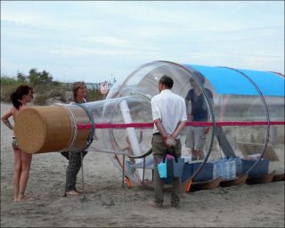 On pénètre ensuite par un sas sur la terrasse extérieure du Frac, en cœur d’îlot, où est installée la bouteille géante. Celle-ci est habitée jour et nuit pendant une semaine par Abraham Poincheval qui y dispose de tout le nécessaire vital pour y vivre en complète autonomie, comme dans un bateau. La bouteille forme alors un espace de vie qui permet à l’artiste de s’intégrer dans le bâti environnant. Elle devient un poste d’observation à double sens : Abraham Poincheval scrute le monde qui l’entoure et les passants s’intéressent à cet homme soumis au regard de tous, enfermé entre des parois transparentes.