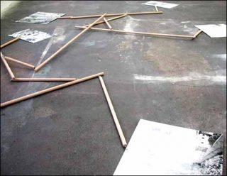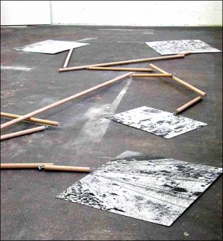 Dans un plus grand espace, repose au sol Collapsed Mobile, un mobile de bois effondré, aux extrémités duquel sont accrochées des images en noir et blanc. Images qui se trouvent être des « prélèvements » opérés dans la photographie précédente. Collapsed Mobile est un objet à la fois simple et déroutant, tant dans son articulation, calquée sur le modèle d’un sobre mobile de bois disposé au sol selon la forme aléatoire de sa chute, que par son statut de support d’une actualité fragilisée et éparse, dont chacun des morceaux semble revendiquer une impossible indépendance, une légitimité en dehors de l’image-source.