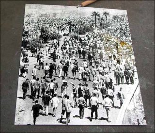 Un agrandissement d’une photographie de l’Agence France Presse sérigraphié en rose sur émail est accroché, seul, dans une petite salle carrée. La trame très apparente indique bien que l’image est extraite d’un journal. Mais les références de cette image, qui montre clairement une foule gigantesque se dirigeant vers un épais nuage de fumée au loin, restent indéterminées, brouillées par son échelle et sa couleur autant que par l’absence d’indications. Cette image médiatique, sans nul doute politique et vraisemblablement largement diffusée, est décontextualisée par l’artiste, qui réussit à convertir un événement d’une violence certaine en image autre, interprétable par le spectateur en fonction de sa propre histoire. Le fragment d’actualité ne vaut pas ici pour ce qu’il contient, mais plutôt pour ce qu’il reste à en percevoir, une fois son origine intentionnellement gommée.