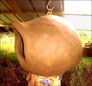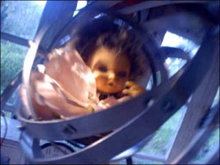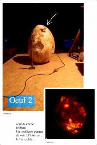 Une pièce récente, réalisée pour « Les Inattendus », fait ainsi voir une grotte en terre sculptée, sorte de cocon fœtal à l’intérieur duquel a été mise une poupée, elle même placée dans un enchevêtrement de cercles en aluminium décrivant un mouvement de rotation permanent. L’épaisseur des parois souligne la dimension protectrice de cette enveloppe de terre, la frontière entre l’intérieur et l’extérieur de l’œuvre.