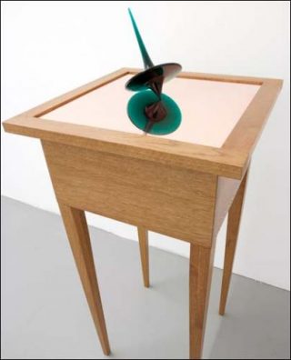 — Dominique Blais, Entropê, 2014-15. Verre, oxyde de cuivre, cuivre, chêne massif. Verre : 23,5 cm × Ø 14,5 cm. Socle: 110 × 55 × 55 × cm. Réalisation: CIRVA, Marseille (verre). Atelier Marc Descarrega, assisté de Marine Anglard (ébénisterie).