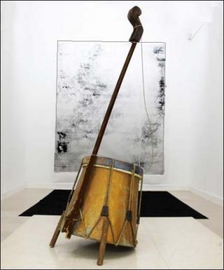 — Contrebassine, XXe s. Acier, peinture, peau, fibres végétales, bois, cuir. 125 × 41 × 50 cm.