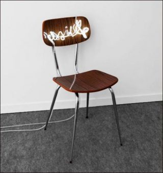 Claude Lévêque travaille la rencontre de matériaux comme d’autres travaillent le verbe, il crée des impressions antagonistes, des visions poétiques. Il se souvient de choses que personne n’a vues. Il produit l’envers noir dans la couleur et la lumière dans l’obscurité. Aux Salaisons, une chaise en formica, de celle qu’il y a dans les cuisines de pauvres avec un rêve assis dessus. À moins que cela ne soit le souvenir d’un enfermement.