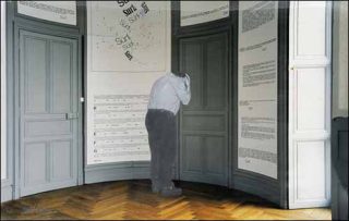 En effet, ces artistes insistent sur L’Origine du monde de Courbet, œuvre qu’ils reproduisent, mettent en scène, jouant sur la taille de la reproduction, le fond de couleur sur lequel elle est représentée, la sérialité. De même, ils utilisent des textes de critiques d’art comme matière première de leurs dessins, n’hésitant pas à s’auto-citer et à alimenter des débats esthétiques, à l’exemple de ce grand panneau sur lequel, d’un geste autoréflexif, l’artiste intervient picturalement sur son propre texte.