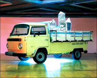 Plusieurs séries de pièces s’appellent donc Anti-pure et jouent sur la notion de blancheur, d’innocence, de pureté. L’une d’elle représente une espèce de radeau à la dérive sur lequel sont plantés des cristaux (ou des obélisques) en polystyrène, qui renvoient donc très bien la lumière, et sont éclairés par intermittence par trois gros stroboscopes. Cette blancheur, évoquant logiquement quelque chose de doux, de subtile — contrairement au noir qui rappelle le triste, le sale, le malin —, devient ici très violente par le biais de ce matraquage binaire. Le blanc finit par faire très mal au yeux, et le regard se pose ensuite sur un petit néon écrivant « anti » à l’envers, toujours dans ce positionnement binaire, d’être pour ou contre quelque chose. Cette confrontation représente la rébellion, adolescente par exemple, et devient pourtant le seul endroit où peut s’accrocher le regard sans être agressé.
