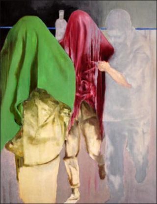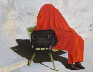 Bruno Perramant. Il y a longtemps, j’avais le pressentiment qu’au fur et à mesure que le travail évoluerait, j’aurais de moins en moins de contraintes parce qu’il y aurait comme une espèce d’auto-engendrement du travail par lui-même. Plus la richesse augmente et plus les possibilités d’engendrement augmentent aussi. Par exemple, les prisonniers comme les mariées procèdent directement des fantômes, ce sont des recouvrements ou des dévoilement progressifs. Le personnage avec la couverture rouge du tableau La Couverture rouge (Léviathan), s’inscrit dans le corpus des prisonniers. Je n’ai pas besoin de chercher, c’est comme si le travail était une matrice vivante qui fabriquait elle-même ses propres enfants.