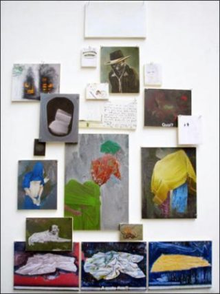 Marie-Jeanne Caprasse. Votre peinture se nourrit autant du monde des idées que celui des images. Vous avez d’ailleurs souvent intégré des citations ou des bribes de texte au cœur même de vos images peintes. Quelle est la relation qui s’est installée entre ces deux univers (l’image et le texte)? A-t-elle évolué? Dans cette exposition, le texte a presque disparu des tableaux.