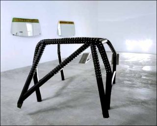 Le titre, Characters (2004) pour personnages : les pare-brise peignent, en combinant à chaque fois deux adjectifs, des comportements, des personnalités, des vérités. Ou des vanités, des secrets d’alcôve : au centre de la salle, My Little Underground (2004) concrétise en quelque sorte ces déclarations. Sur cette structure métallique qui reprend l’ossature primitive de la voiture, une housse de cuir noir percée de clous façon rite sado-maso. La voiture serait donc chez Rousseaud la partenaire intime et secrète. Mieux, la maîtresse, dans tous les sens du terme. Non seulement elle expose sa face féminine, mais elle est également un puissant objet de désir.
