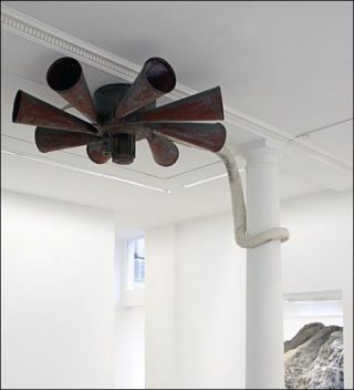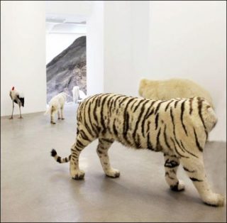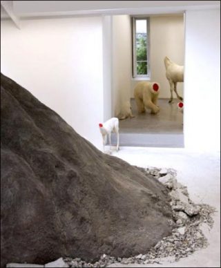 Ce monde post-apocalyptique pourrait ressembler à une terre désolée et dévastée, où subsisteraient seulement quelques créatures. Tel semble être en tout cas ce qu’imagine ici Huang Yong Ping: une chèvre blanche décapitée nous accueille dans la première pièce de la galerie, qui demeure d’ailleurs étrangement vide. On perçoit l’arrière-train d’un chat blanc à l’angle d’un mur, s’échappant vers la salle d’à côté, tandis qu’au plafond se trouve fixée une alarme, hérissée de haut-parleurs rouges.