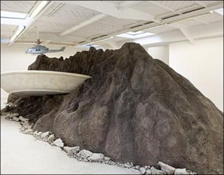 Nous pénétrons alors dans la petite salle du fond de la galerie où se dresse une impressionnante installation, reproduction à échelle réduite du site de Bugarach, que Huang Yong Ping a patiemment élaboré après avoir étudié la topographie du site. Au vide de la première salle succède ici un espace totalement saturé. En effet, l’installation va d’un bout à l’autre de la salle et pratiquement jusqu’au plafond, où un hélicoptère survole la montagne.