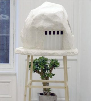 Vue d’ici, cette joute de voisinage semble autrement plus trépidante qu’un débat ontologique s’évertuant à départager la sculpture de la maquette d’architecture. Gîtes fantasmés par le voyageur avide de grand air conditionné –celui qui se contente du dépaysement offert en classe économique pour s’épargner l’effort des vacances – ces objets s’érigent fièrement comme emblèmes d’un authentique désir d’ailleurs pantouflard, une rêverie pittoresque qui trouve l’inspiration chez Leroy Merlin.