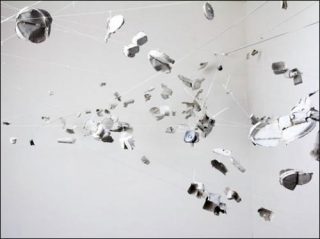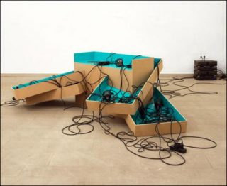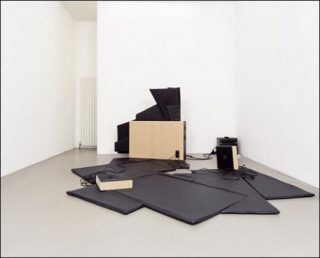 D’autre part, il utilise un système d’assemblage laissant une large part au vide et favorise ainsi la notion de contexture pour créer sa sculpture, qui renvoie directement à l’instrument de prédilection de la musique concrète: «l’orchestre» de haut-parleurs ou acousmonium. Mais il se détache de ce dernier, pensé comme un système frontal se projetant vers l’auditeur, au profit d’un éclatement spatial sans frontière entre l’œuvre et le visiteur. Bursting confidence évoque d’ailleurs une explosion en pleine stase au plus fort de son développement dans laquelle le visiteur est invité à déambuler.