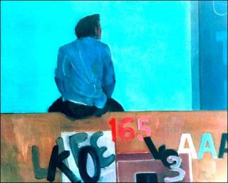 Les petites toiles de Stelvio Gambetti disent encore cet isolement. Les couleurs rabattues et ternes y transforment le bleu du ciel en métaphore du néant. Des personnages vus de dos se perdent dans cette vacuité vertigineuse, ou ses substituts publicitaires, dans une ville compartimentée, contingentée, où, ça et là , s’immiscent les graffiti d’une rébellion muette.