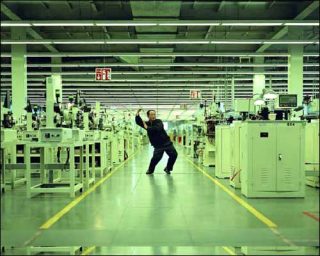 Des lits superposés sont jonchés d’objets rose-bonbon, de vêtements et de chaussons de petite fille, et des moniteurs sont enfouis dans les cartons amoncelés. Cela provient de l’action que Cao Fei a menée auprès des ouvriers de l’usine Osram, oscillant entre des évaluations de vies et des danses délurées dans les couloirs de la fabrique.