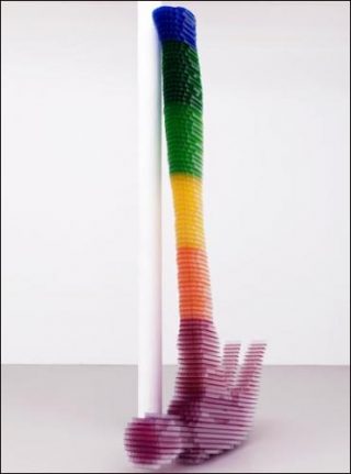 Chacun des ces objets est ensuite réalisé dans le même polycarbonate bon marché; chacun est fabriqué exactement selon le même processus de production; chacun utilise la même coloration immédiatement reconnaissable obtenue à l’aide de l’échelle des huit couleurs de teinte/saturation de Photoshop et chacun est mis à l’échelle pour que sa masse corresponde à celle d’un être humain moyen. Toutefois, aucune de ces sculptures n’est produite industriellement, comme on pourrait s’y attendre; elles sont dessinées, coupées et assemblées à la main par Matthew Darbyshire lui-même, dans son atelier.