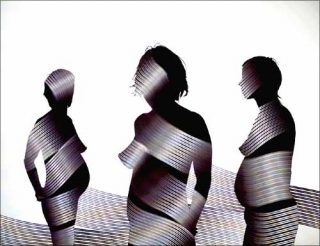 Elles s’animent au son d’une mélodie grinçante. De minces rubans blancs et roux ondoient à la surface et se superposent aux corps féminins en silhouette. Ces personnages anonymes, sans visages semblent se débattre pour échapper à ces mailles acérées.
