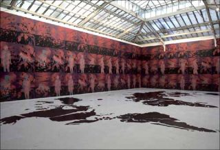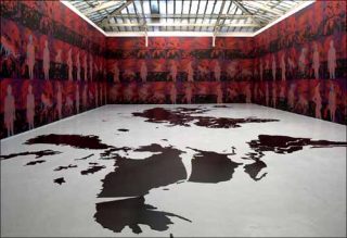 Au sol, un puzzle fait de plaques de plastique noir mat, reconstitue la carte du monde. Les pays décomposés se répandent, s’étalent et nous obligent à longer les murs. Comme une marée noire, les continents se disloquent et laissent apparaître des failles. Le manque de relief et de différence entre toutes ces terres étrangères souligne-t-il la perte d’identité déjà présente chez les personnages inventés par l’artiste?