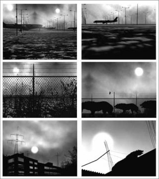 Telle une toile tissée, les stries se multiplient et laissent s’échapper çà et là des singes aux crânes squelettiques. Courte pause: le blanc réapparaît. Il est bientôt infesté d’oiseaux noirs qui prolifèrent au premier plan pour s’éloigner petit à petit. Ils disparaissent enfin au creux de l’écran, créant ainsi une profondeur inattendue dans cette obsédante planéité.