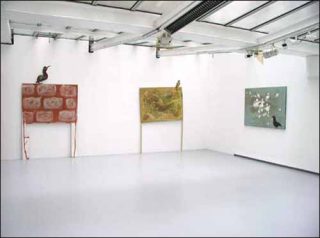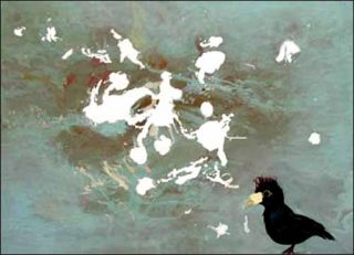 Un mur de pierres bistres, peintes en trompe-pas-l’œil sur un panneau de bois que déséquilibre un pigeon hors-cadre, posé sur le coin. Un autre mur, couleur rouille, sur lequel un cormoran noir se sèche, le bec relevé, également hors-cadre comme le pigeon. Plusieurs tableaux illustrant une topographie maritime transformée en une image d’écume de mer, en une déferlante de mousse blanche que des oiseaux cherchent à éviter en sautant hors du cadre.