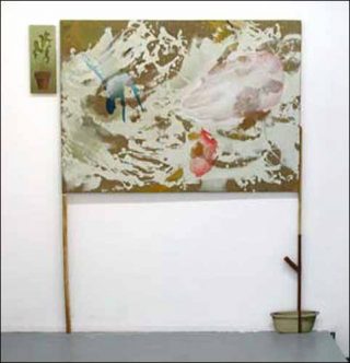 L’ensemble de ses installations crée le vernaculaire d’un peintre qui fait sérieusement son travail, mais tout en ne se prenant pas au sérieux. Est-ce une trace d’humour latino ? On l’imagine éclatant de rire en peignant le pied du tasseau plongé dans un baquet d’eau et dans un bocal de verre, ou en rajoutant, à côté du panneau illustrant de l’écume blanche, un petit tableau représentant une sorte de chardon planté dans un pot de terre cuite. Faut-il que nous cherchions, pour cette présence, une raison qui n’en a peut-être pas ou une histoire que le tableau ne raconte pas ?