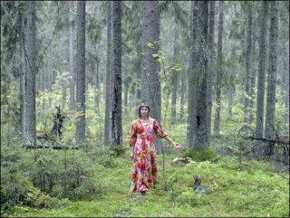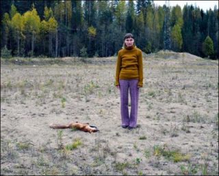L’ambiguïté réside aussi dans le sentiment double autour de ces images: l’être humain, parfois en symbiose avec son milieu naturel, à d’autres moments n’appartient plus à celui-ci. Marcello’s Theme (2015, durée 6′ 11 ») est une vidéo énigmatique mettant en scène l’artiste avec un chien dans une forêt ou dans un terrain à l’orée d’une ville, se recueillant près d’un renard mort. Plus tard, on la retrouve à l’intérieur d’une maison, contemplant les forces de la nature derrière une vitre. L’accordéon de Maria Kalaniemi participe à un état de méditation. Chaque partition est marquée par un cadrage différent, un costume différent contrastant avec l’environnement ou au contraire s’y fondant. S’agit-il ici d’un questionnement sur notre identité, renvoyant dos à dos la part d’humanité et d’animalité en chacun de nous?