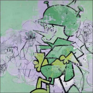 L’artiste détourne ici à sa manière le principe de la fragmentation, implicite dans l’utilisation de l’abstraction pour livrer une vision construite des différentes facettes d’un personnage; les cartoons ne sont que le point de départ d’une interprétation libre et personnelle de cette réalité complexe.