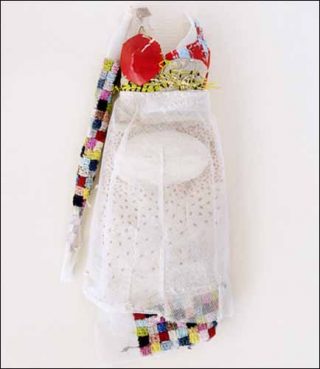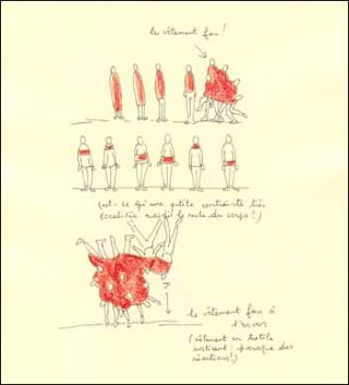 Catherine Noury. Ma démarche se situe entre celle de la couturière et celle du sculpteur : je cherche par exemple, à savoir comment fonctionne un buste, ou bien une manche… Je fais des petits patrons en papier ou en carton, et à partir de là , la forme de la robe se déploie d’elle-même. Je rajoute, je coupe, je déchire, je raccommode, et à un moment donné… c’est fini. Les dessins préparatoires que je conçois en parallèle, relatent des univers plus ou moins liés aux robes. Le vêtement est une contrainte pour le corps. Si la robe est cintrée dans le dos : on respire moins bien dedans. Le vêtement conditionne l’attitude. Ces dessins, faussement préparatoires, esquissent en fait, des silhouettes contraintes par un petit handicap et dont on observe le mouvement. Sur l’un d’eux, le chapeau est conçu comme un sac, ce qui oblige la silhouette à se faire guider par quelqu’un… Je mets le personnage dans une situation qui l’oblige à se dépatouiller de cette difficulté.