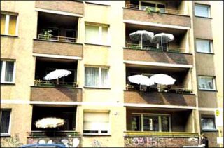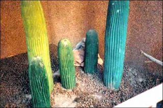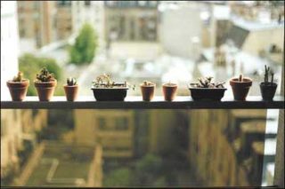 Cécile Paris se promène dans la ville. Une rangée de petits cactus en pots sur le rebord d’un balcon. L’œuvre est une photographie couleur montée sur un petit caisson lumineux. L’alignement végétal, souligné de la barre horizontale du balcon, sépare l’image en deux zones de lumière, aveuglante en haut, jaune et ombrée en bas. Derrière les cactus c’est flou, un flou d’immeubles. Après la ligne des cactus, c’est la ville. De l’autre côté des cactus, c’est le vide. La banalité du quotidien qui met la «barre» assez haut, et donne au dérisoire une réalité de sens.