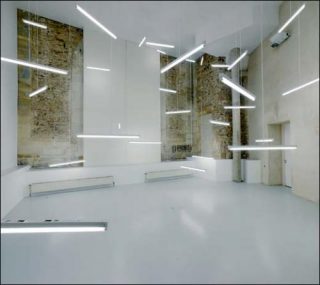 Il s’agit donc de guérir par la lumière, mais également de se laisser bercer par les tubes suspendus qui tourbillonnent comme des palmes. Leur mouvement régulier, lent, hypnotique, nous apaise et nous extraie de la frénésie urbaine, du rythme dément de nos vies. Enfin, notre imaginaire se libère, on divague, et l’on croit percevoir dans cette colonie de néons planant dans les airs, une meute de mouettes ou de colombes aux blanches ailes balayant l’horizon…