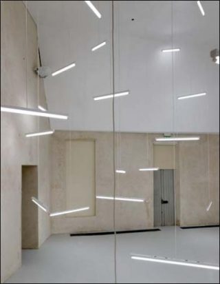— Berdaguer & Péjus, 40 soleils, 2015. Tubes fluorescents de luminothérapie, moteurs. Installation in situ. Vue de l’exposition «Centrale Spirale» à La Maréchalerie, centre d’art contemporain de l’Ensa-Versailles, 2015.