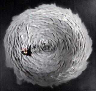 D’ailleurs, la vidéo Timezone travaille encore sur la question du temps et de sa représentation cyclique. Car si le tournoiement des tubes fluorescents de 40 soleils évoquait déjà le fonctionnement d’une horloge, le performer de Timezone tourne aussi en rond dans un bac de sable gris, à la manière d’une aiguille ou d’une trotteuse parcourant une pendule. Sa course rappelle l’irréversibilité du temps, et fait écho à la métaphore employée par Robert Smithson pour expliquer la notion d’entropie: dans un bac rempli de sable noir d’un côté, et blanc de l’autre, court un enfant dont les pas brassent la matière jusqu’à la rendre grise.
