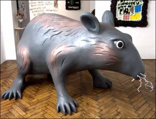 On aborde l’exposition par le rire, un rire salvateur suscité par cette gigantesque souris grise qui nous accueille à l’entrée de la galerie. L’Homme se mesure alors à l’aune de cette souris. Métaphore de notre désir vaniteux de grandeur ou simple farce ? La question reste sans réponse, à moins que l’artiste ne désire cheminer du côté de nos peurs enfantines, de nos cauchemars et névroses.
