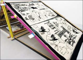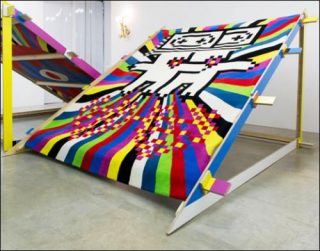 Sur les surfaces planes du paravent, des tapis ou du pouf se développe un travail proprement graphique. On retrouve les tracés noirs, les superpositions photographiques et les associations colorées que certaines de leurs réalisations antérieures nous ont rendues familières. Le traitement des signes intègre et dépasse leur propre répertoire. Ainsi le Pouf (C’est Wouf!) (2013) réalisé spécialement pour l’exposition, est un montage visuel où l’innovation côtoie la citation ; sur sa face rectangulaire l’ancien logo de la galerie apparaît au détour d’une autre forme, indice d’une collaboration de longue date. Il est surmonté de Wouf dont le dessin simplifié en fait sans doute le nouveau compagnon de «The Agent», autre personnage récurrent.