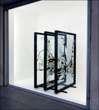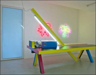 La présence du duo dans une galerie d’art aurait donc pu nous étonner. L’exposition occupe la vitrine extérieure et quatre espaces de la galerie, seules sont montrées des pièces en volume. Graphistes, mais designers aussi. Au premier abord il n’y a pas de méprise possible, ce ne sont pas des œuvres d’art mais bien des objets à dimension fonctionnelle: un pouf, une applique, quatre tapis, une table, divers luminaires, un portant et un paravent. Certaines pièces sont même des reproductions dont les versions «originales» occupent activement leurs fonctions: l’Applique [Thoumieux] (2010) a été créée pour une brasserie parisienne, et l’Infinitable [Mise-en-abîme] (2011) est inspirée de la table de travail de M/M toujours présente dans leurs bureaux.