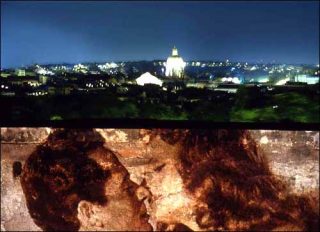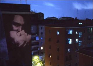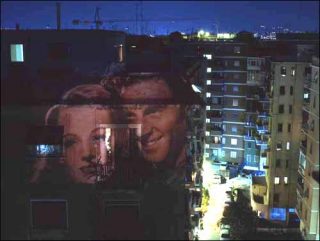 À la Galerie de France toutes les œuvres connectent de diverses manières le cinéma et les arts plastiques, essentiellement la photographie. À commencer par les grands cibachromes (tirages photographiques en couleur) accrochés à l’entrée de l’exposition (Cinecitta, 2003). L’artiste a projeté sur une façade d’immeuble l’image d’un couple d’acteurs célèbres de cinéma. Puis il a photographié cette projection en intégrant dans son cliché une partie de la ville. Rencontre entre la ville endormie, les représentations nocturnes et le cinéma—rencontre renforcée par le format horizontal des œuvres qui évoque l’écran de projection.