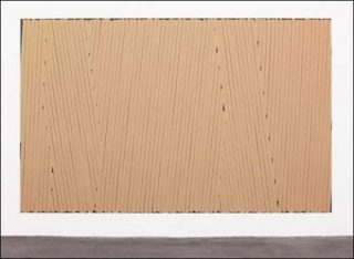Spécialement réalisés pour l’exposition, les quinze «tableaux-scotch» relèvent avant tout de la composition abstraite: des juxtapositions d’empreintes de bandes de ruban adhésif, couleur chair, se détachent sur fond noir. Une partie d’entre eux repose sur un principe de répétition et présente des alignements de bandes parallèles, de même épaisseur, quand deux petits formats — quatre bandes «chair» encadrant un monochrome noir — annoncent plus clairement, du moins en surface, un refus de la représentation.