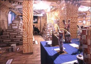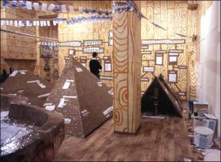 Ailleurs une table expose une multitudes d’objets-souvenirs égyptiens. Partout, des pyramides constituées de cannettes de bière, de paquets de cigarette, de parpaings… Plusieurs d’entre elles, recouvertes de scotch marron, fonctionnent en fait comme des maquettes qui montrent en coupe l’intérieur d’une pyramide.