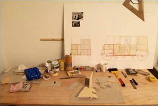 Un garage transformé en paradis du bricolage est installé dans la première salle de l’exposition: perceuses, bois de coupe, scies, règles, compas sont disposés ici ou là de même que des plans de fabrication sont accrochés au mur, sans oublier la douce odeur de sciure de bois et la musique qui sort du poste à côté de la table de travail… Bublex nous rappelle à une autre temporalité, celle de la création lente et progressive d’une voiture Meunier-Béraud en bois, voiture utopique qui ne roulera jamais.