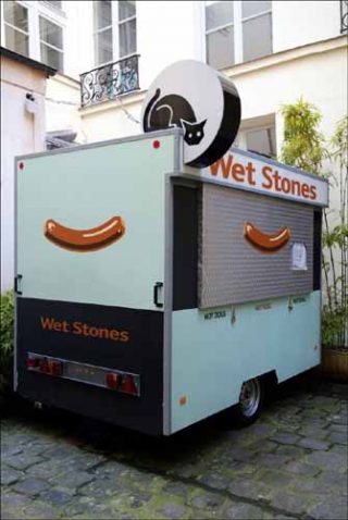 — Le Kiosque Wet Stones, 2006. Caravane, peinture acrylique, enseigne lumineuse. 277 X 394 X 178 cm.