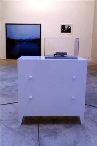 — 1-24 ème (Commode, 2006. Technique mixte: maquette de voiture inachevée sur socle laqué blanc. 114 X 86 X 43 cm.