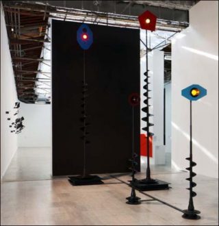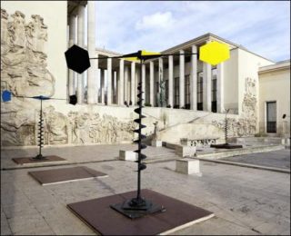 De Takis, on connaît surtout aujourd’hui ses fameuses sculptures, nommées Signaux, qui trônent depuis 1988 sur l’Esplanade de la Défense, à l’instar de la fontaine Stravinky créée par Jean Tinguely devant le Centre Pompidou. L’exposition du Palais de Tokyo s’ouvre justement avec quatre de ces sculptures de fer longilignes, coiffées d’un phare lumineux, dont la forme élancée a été inspirée par Alberto Giacometti. Mais si Takis est reconnu comme un sculpteur incontournable de la seconde moitié du XXe siècle, son œuvre se réfère aussi principalement aux sciences et au pouvoir du magnétisme.